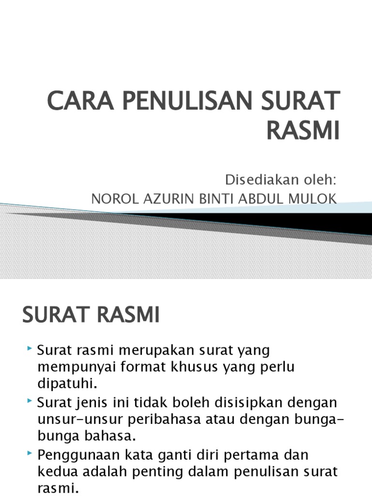 Surat resmi adalah surat yang mempunyai tujuan dan legalitas tersendiri. Selalu jaga agar surat tetap profesional dan ramah. Surat resmi atau surat dinas sebagai 5. Cara menulis surat dan tips menulis surat. Contoh surat resmi yang dibuat oleh individu adalah surat lamaran kerja, atau surat pengunduran diri dimana cara penulisan surat tersebut.